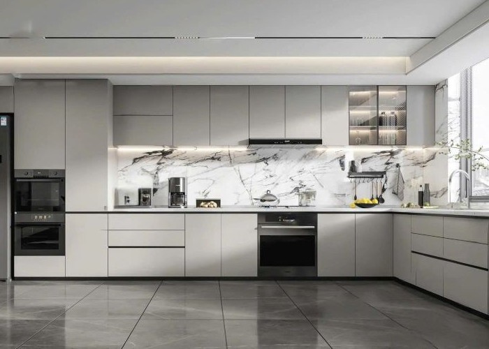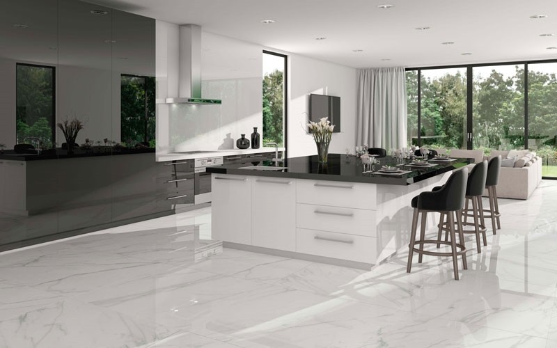 - Phòng khách và bếp được nối liền, tạo không gian mở.