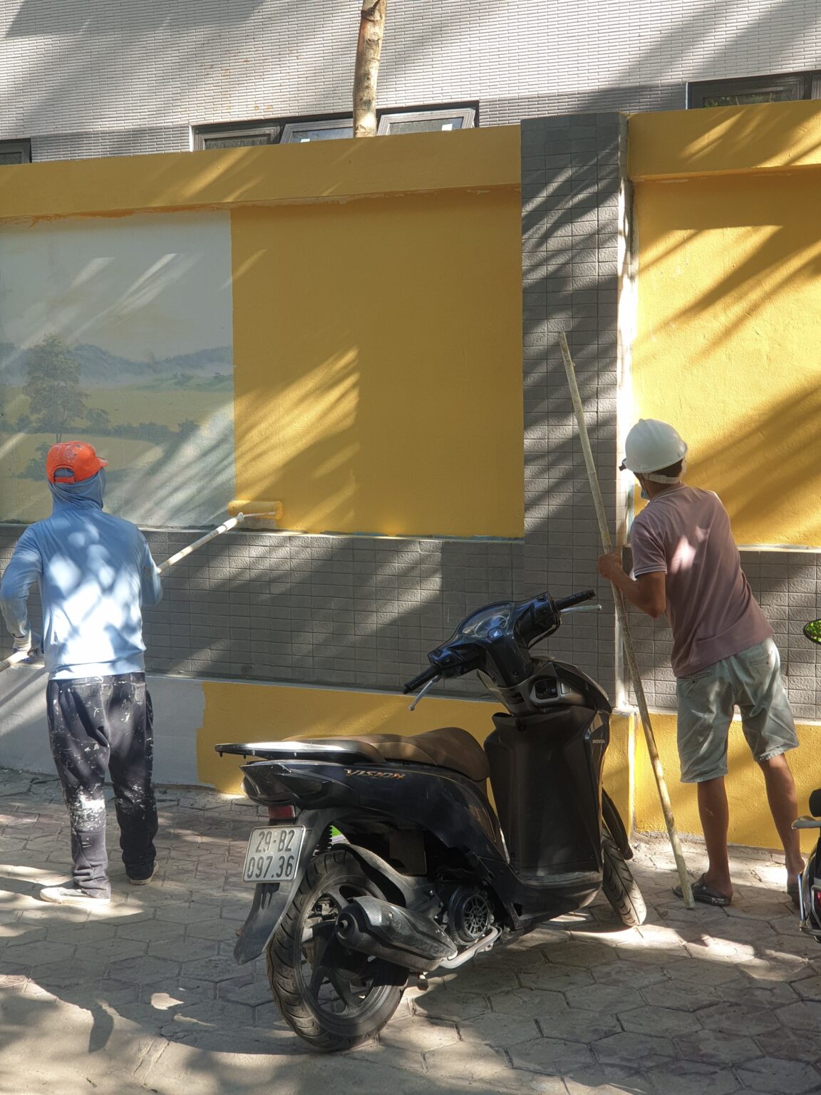 Khi bề mặt đã được chuẩn bị xong, đội ngũ sẽ tiến hành công đoạn sơn. sẽ bắt đầu bằng lớp sơn lót để tạo độ bám dính cho lớp sơn phủ sau đó. Sau khi lớp sơn lót khô, họ sẽ áp dụng lớp sơn phủ với màu sắc và loại sơn đã được lựa chọn trước đó.