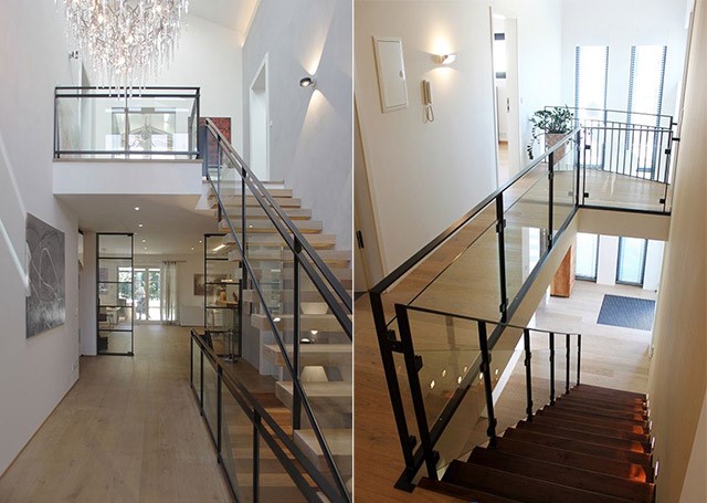 - Kính cường lực kết hợp tay vịn inox, gỗ hoặc thép hộp.